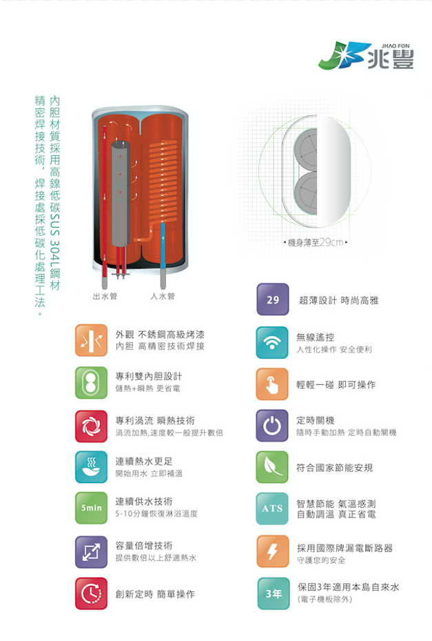 兆豐 MIT 台灣製造的電能熱水器,結合專利技術與高規格安全設計,專為現代家庭的熱水需求打造。不僅具備 三年原廠保固,更選用台灣生產的高品質材料,從內到外都經得起時間與環境的考驗。內桶採用 不鏽鋼304材質,耐腐蝕、不易生鏽,可長期使用;外桶則使用 不鏽鋼430烤漆,提升結構強度與防護效果。