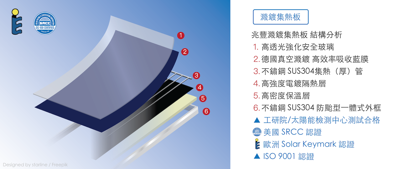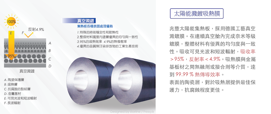 兆豊太陽能集熱板,採用德國工藝真空濺鍍膜。在連續真空艙內完成奈米等級鍍膜,整體材料有優異的均勻度與一致性。吸收可見光波 和短波輻射,