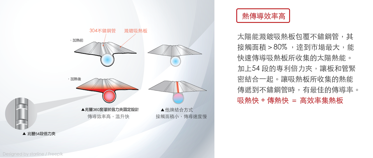 以及54段的專利倍力夾,讓板和管緊密結合一起。吸熱板所收集的熱能傳遞到不鏽鋼管時,有最佳的傳導率。